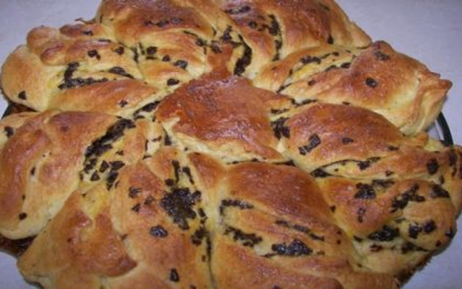 Με ένα κοφτερό μαχαίρι κόψτε ξεκινώντας από το πιατάκι προς την περιφέρεια 16 κομμάτια. Στρίψτε κάθε κομμάτι στριφογυρίζοντας το 3 φορές σε σπιράλ.