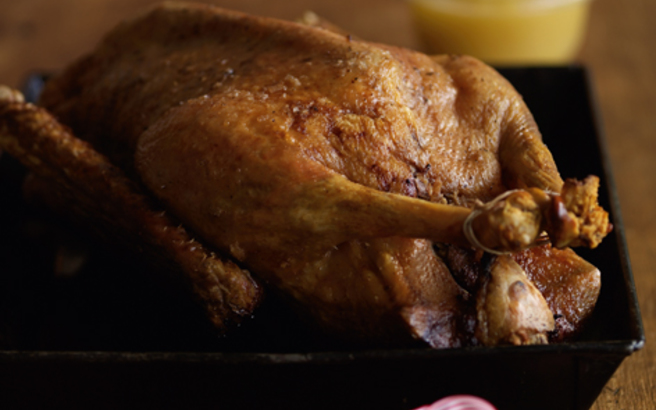 Όταν ψηθεί, ρίχνουμε όλους τους χυμούς του ταψιού σε ένα κατσαρολάκι για να κάνουμε τη σάλτσα. Προσθέτουμε το αλεύρι και σιγά σιγά το ζωμό του κοτόπουλου και το ζελέ κερασιού ή φράουλας. Σιγοβράζουμε τη σάλτσα ανακατεύοντας, μέχρι να πήξει.
