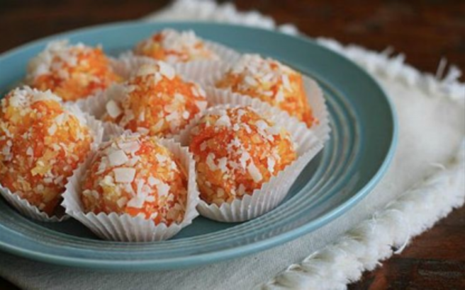 Πλάθουμε μικρά μπαλάκια και περνάμε το κάθε ένα στην υπόλοιπη ινδική καρύδα. Τα διατηρούμε στο ψυγείο.