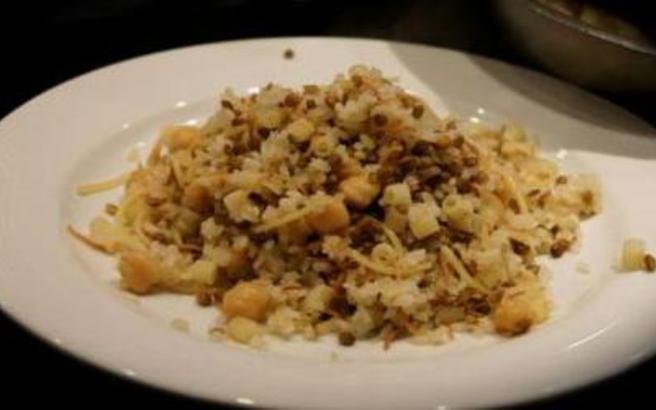 Ανακατεύουμε τα μακαρόνια με το ρύζι και τις φακές. Χτυπάμε με ένα πιρούνι το ξίδι μαζί με το πολτοποιημένο σκόρδο και περιχύνουμε. Σοτάρουμε τα κρεμμύδια σε μια μικρή κατσαρόλα και μόλις ροδίσουν, ρίχνουμε τις ντομάτες, το νερό, τη ζάχαρη, τα μπαχαρικά και τα βάζουμε να πάρουν μια βράση. Ριχνουμε το καυτό μείγμα μέσα στην πιατέλα με τα υπόλοιπα υλικά.