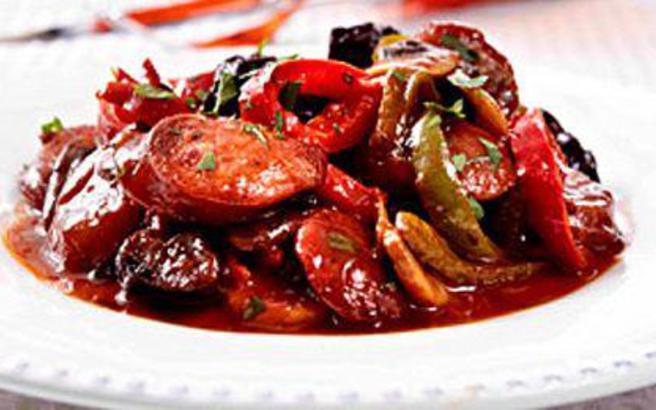 Τα σουρώνετε και κρατάτε ¼ (60 ml) από τον ζωμό που έβρασαν. Κόβετε τα λουκάνικα σε λεπτές ροδέλες και ανακατεύετε με τα σουρωμένα κρεμμύδια και τον δυόσμο.