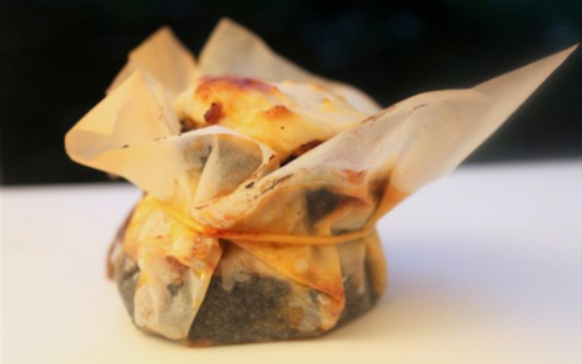 Χτυπάμε το αυγό και αλείφουμε από πάνω τα πουγκάκια και πασπαλίζουμε με λίγο κεφαλοτύρι. Τα ψήνουμε στο φούρνο μέχρι να ροδίσουν.