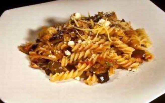 Βράζετε τις βίδες σε αλατισμένο νερό σύμφωνα με τις οδηγίες του πακέτου. Στραγγίζετε και διατηρείτε ζεστά. Στο μεταξύ ζεσταίνετε το λάδι σε φαρδύ αντικολλητικό τηγάνι. Ρίχνετε μέσα τους κύβους της μελιτζάνας μαζί με τρεις κουταλιές νερό.