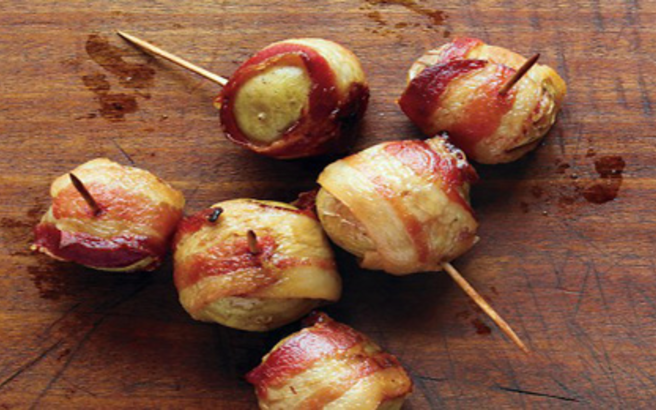 Για κάθε σουβλάκι περνάμε 4 με 5 κομμάτια, ανάμεσα ελιές. Τα ψήνουμε στο γκριλ που έχουμε ζεστάνει στους 200 βαθμούς, μέχρι να πάρει χρώμα το μπέικον.