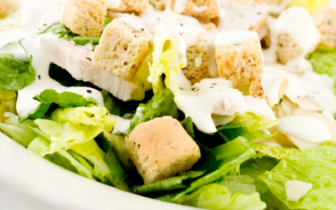 Προσθέστε στα λαχανικά τη σάλτσα και συμπλήρωσε με 4 κουταλιές της σούπας ελαιόλαδο. Τέλος, πασπαλίστε με κρουτόνς.