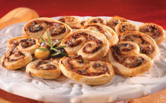 Προθερμαίνουμε το φούρνο στους 200 βαθμούς. Βάζουμε το φύλλο σφολιάτας στον πάγκο εργασίας και απλώνουμε επάνω το μείγμα της πάστας ελιάς.