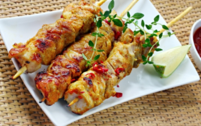 Περάστε ένα - ένα τα κομμάτια κοτόπουλου μέσα στα ξυλάκια και αλατίζετε ελάχιστα. Ψήστε τα σουβλάκια για περίπου 25 λεπτά μέχρι να ροδίσουν.