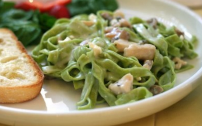 Ρίχνετε τα φασολάκια στο ίδιο τηγάνι, ανακατεύετε το τυρί κρέμα με την κρέμα γάλακτος και τα προσθέτετε και αυτά στο τηγάνι. Αφήνετε να βράσουν για 15 λεπτά σε μέτρια φωτιά και προσθέτετε τα βρασμένα νουντλς. Αλατοπιπερώνετε, ανακατεύετε και αφήνετε στη φωτιά.