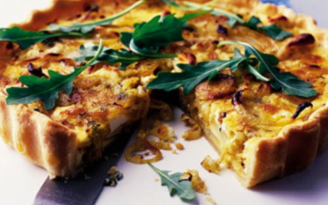 Κόβετε και το λουκάνικο σε μικρά κομμάτια και σόταρε επίσης να πάρουν λίγο χρώμα. Ανακατέψτε τις πατάτες με όλα τα υπόλοιπα υλικά και ανακατέψτε καλά να αναμειχθούν όλα μαζί. Αδειάστε το έτοιμο φύλλο σε ένα μακρόστενο ταψί και ράντισε με λίγο ελαιόλαδο. Τρύπησε το φύλλο σε διάφορα σημεία με μία οδοντογλυφίδα.
