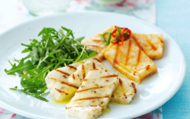 Όταν θα σερβίρετε το χαλούμι, θερμάνετε το ελαιόλαδο σε ένα τηγάνι σε μέτρια φωτιά. Αφού το λάδι είναι πολύ ζεστό βάζετε το τυρί στο τηγάνι – η κάθε πλευρά θέλει 1 λεπτό για να μαγειρευτεί, ώστε μέχρι να βάλετε και το τελευταίο κομμάτι, είναι ώρα να γυρίστε το πρώτο. Πρέπει να ροδίσουν καλά και από τις δυο πλευρές.